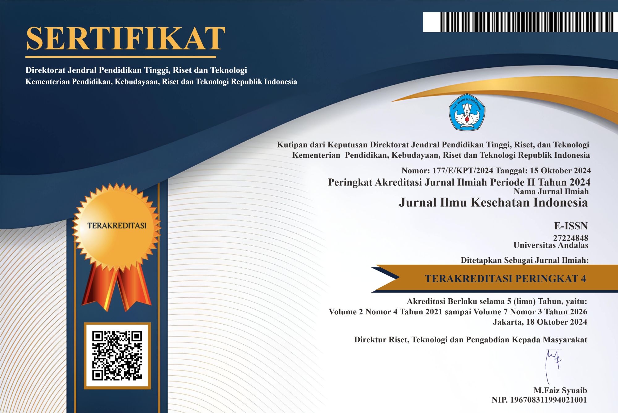 Jurnal Ilmu Kesehatan Indonesia, abbreviated as JIKESI or translated as Indonesian Journal of Health Science, is a scientific, peer-reviewed journal that publishes high-quality research in the field of health sciences. The journal is published by the Faculty of Medicine, Universitas Andalas, Indonesia, and serves as a platform for researchers, academics, and practitioners to disseminate their findings. JIKESI publishes original research articles, review articles, and case reports, which can be written in either Indonesian or English. It is published quarterly and operates as an open-access journal with e-ISSN 2722-4848, ensuring broad accessibility to its content. The journal is indexed in the Directory of Open Access Journals (DOAJ) and SINTA 4, reflecting its commitment to maintaining high academic and publication standards.